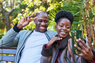 Joyful Couple Taking a Selfie in a City Park on a Sunny Day