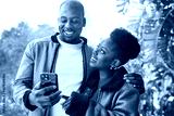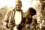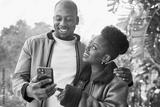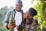 Happy Couple Enjoying Outdoor City Park While Sharing a Moment on a Smartphone