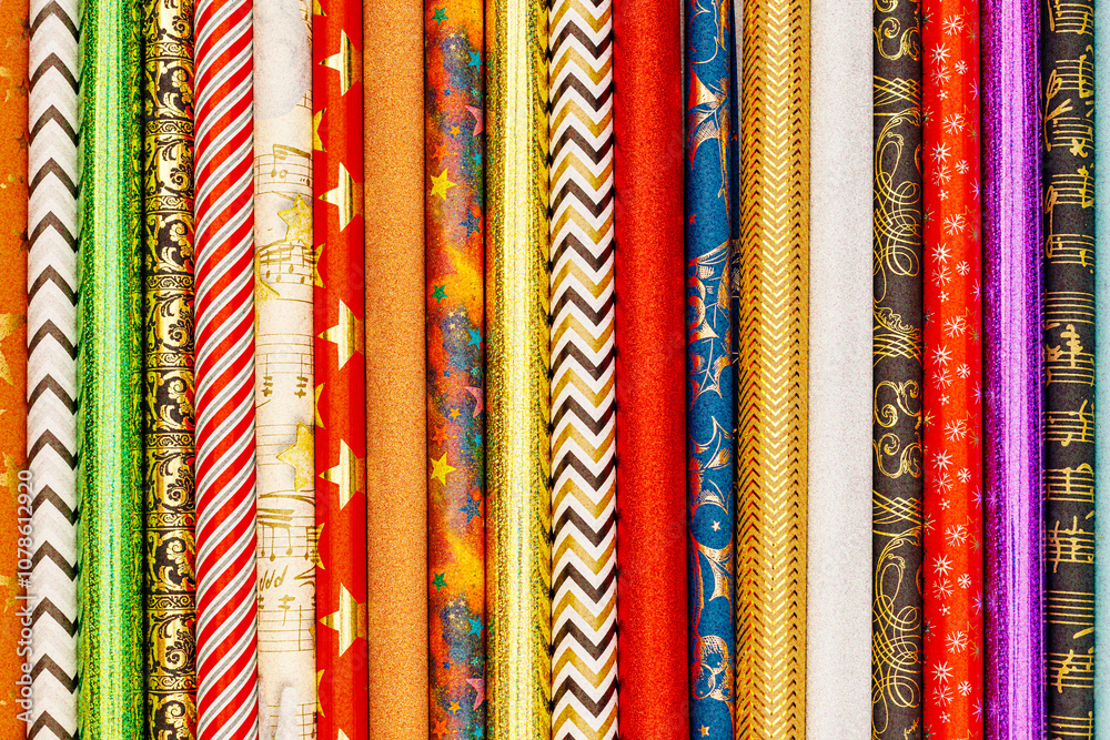 Colorful different wrapping paper rolls. Holiday gift wrapping papers background