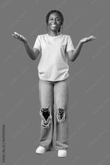 A young woman in casual attire smiles playfully with hands raised in a questioning gesture against a bright green background