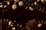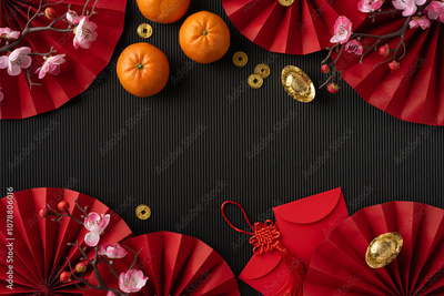 Top view of Chinese New Year decorations including oranges, red envelopes, and gold ingots on a black background