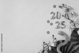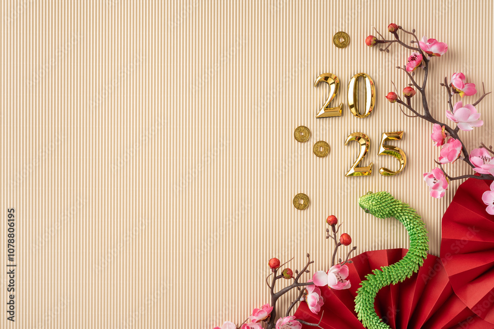 Celebrate the Chinese New Year 2025 with an elegant design featuring golden numbers, vibrant pink blossoms, and lucky coins. Perfect for festive decorations and holiday greetings