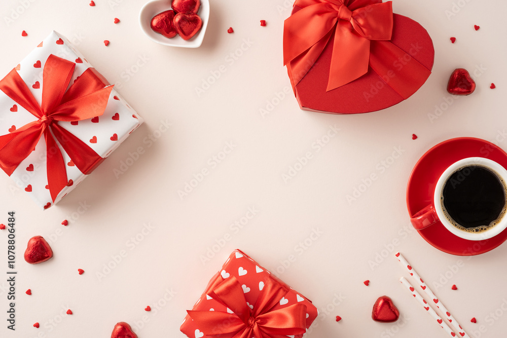 Top view of Valentine's gifts and a coffee cup surrounded by hearts. A perfect romantic setting