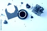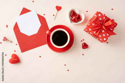 A cozy valentine's day setup featuring coffee, an envelope, a gift, and heart shaped candies, creating a romantic and warm atmosphere