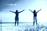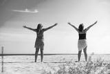 Summer travel destination. Two girls wearing one-piece bathing suit and colorful sarong standing in distance and exposing to sun with hands raised up on beautiful sandy beach on sunny day. Back view.