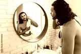Young man grooming himself in a modern bathroom mirror with natural lighting