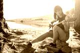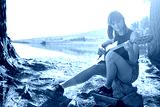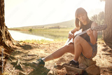 Woman, relax and play with guitar on camp for music performance, summer vacation and morning getaway. Girl, resting and creative instrument with travel peace, song melody and talent of hobby activity