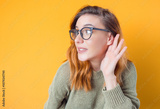 Woman holding hand near ear trying to listen something interesting, isolated on yellow background. Gossip concept