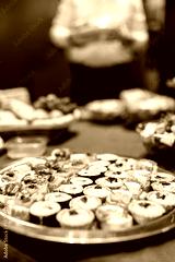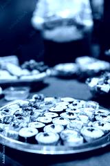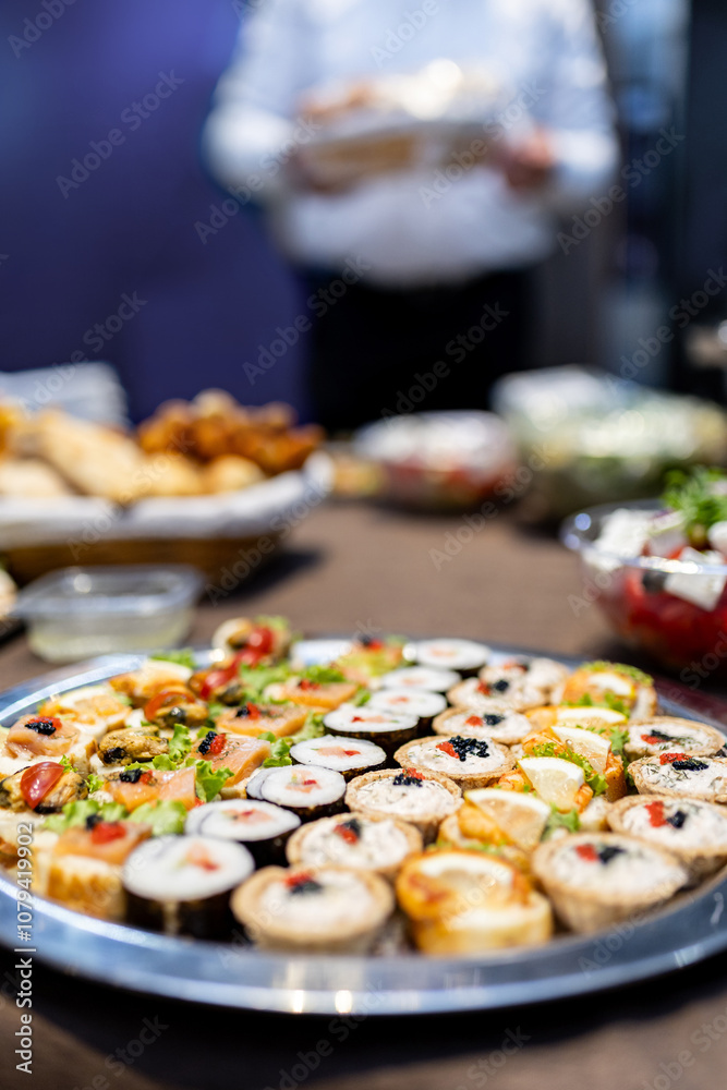 A colorful platter of sushi and appetizers at a festive gathering in a cozy dining area during evening hours