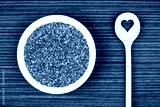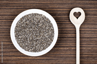 Chia seeds on white porcelain plate with cooking wooden spoon (cut heart shape) on wood background table.