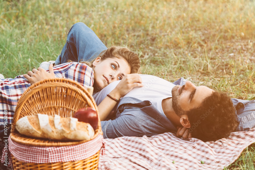 On a late summer day, a pair of young lovers is lying on the grass. The head of the young woman's belly on him. Picture taken in a field in Tuscany, Italy