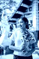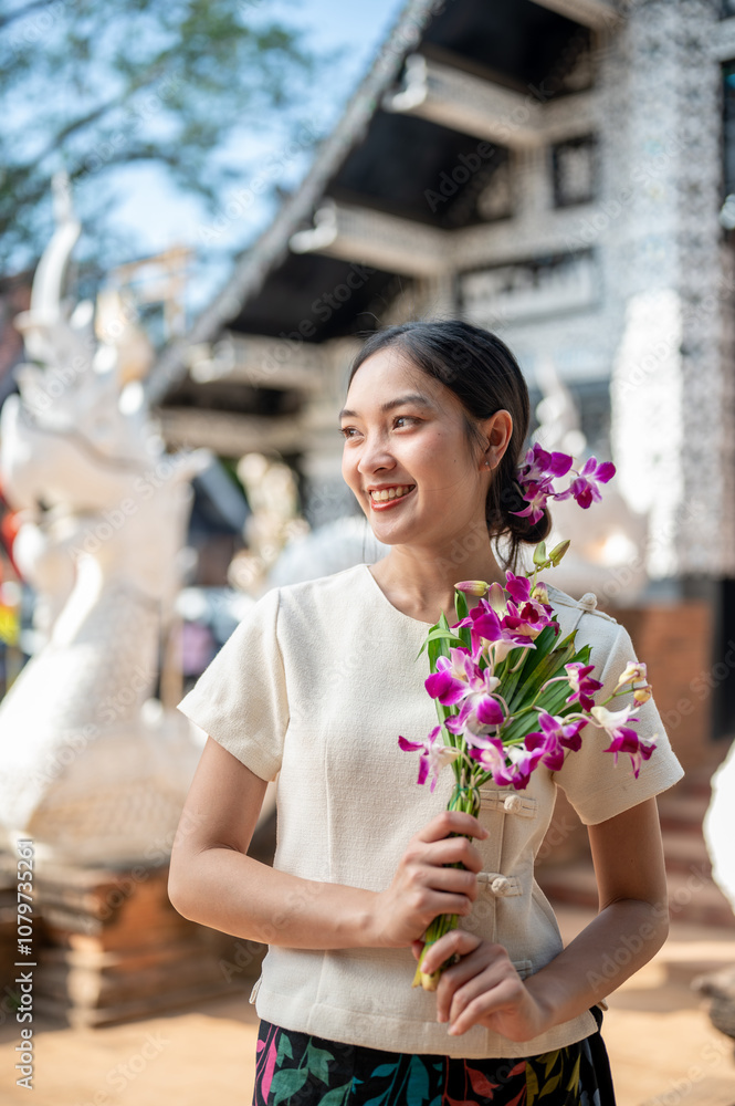 Charming Asian woman in a traditional Thai Lanna dress stands in front of a beautiful ancient temple