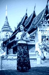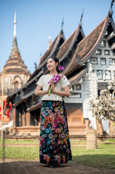 Charming Asian woman in a traditional dress stands outdoors with an ancient temple in the background