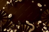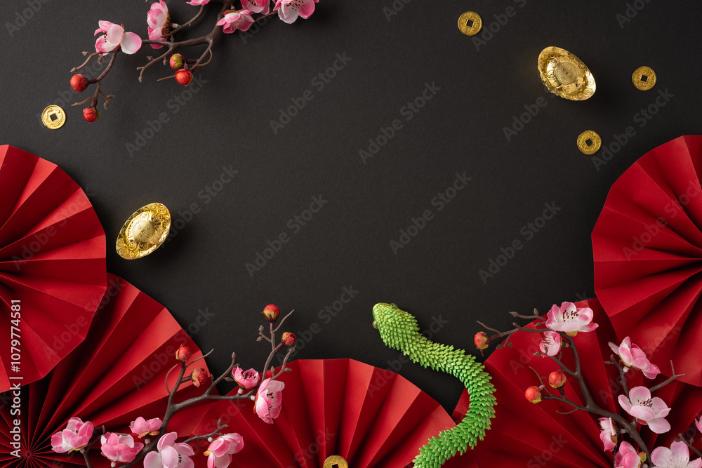 Celebrate the Chinese New Year with elegant decorations featuring red fans, cherry blossoms, gold coins, and a symbolic green snake, set against a dark background for a festive atmosphere