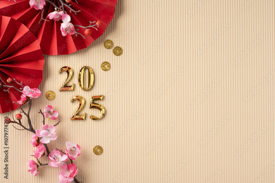 A minimalistic Chinese New Year scene featuring cherry blossoms, gold numbers for 2025, red paper fans, and gold coins on a textured pastel background