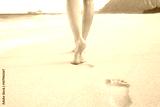 Female walking along the beach leaving foot prints in the sand.