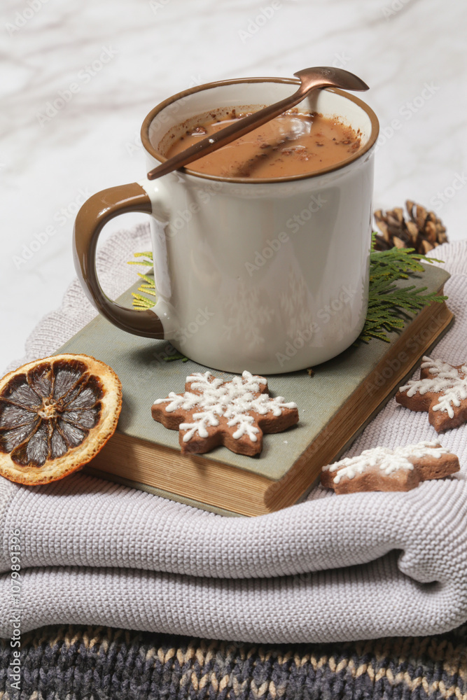Cozy winter lifestyle concept. Mug of hot drink with vintage book and tasty homemade Christmas gingerbread cookies.