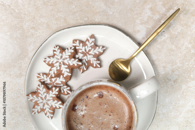 Christmas gingerbread cookies and chocolate milk mug with candy cane stick, concept of winter holidays desserts and decoration