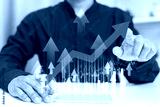 businessman pointing at Trading bar graph grow up. Stock exchange marketing analyzing chart. information statistics diagram profit. investment and marketing concept.