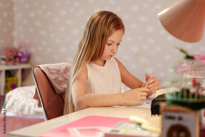 A young girl sits at her desk in her bedroom, focusing intently on a drawing