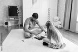 A father and daughter play chess on a white rug in a home