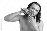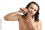 A man with curly hair grooming his beard in a well-lit space while using a straight razor