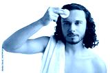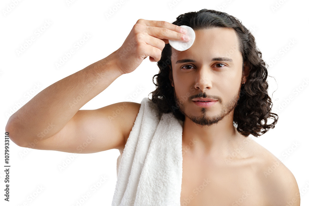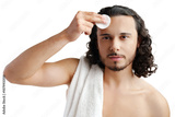 A young man with curly hair applies a skincare product to his face in a well-lit space