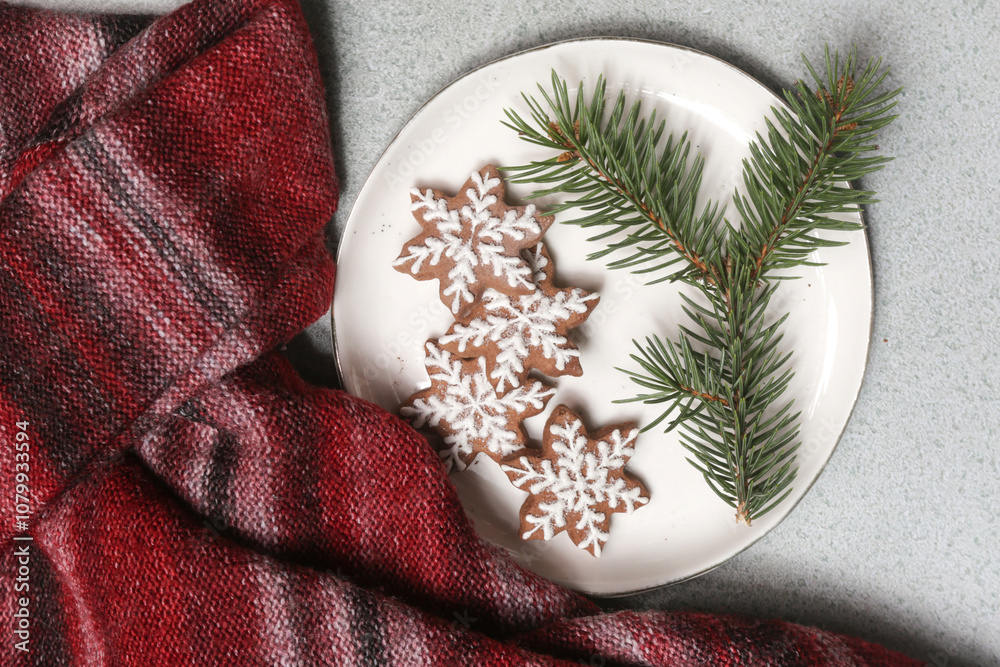 Plate with tasty homemade Christmas gingerbread cookies, top view, flat lay with space for your xmas greetings, concept of winter holidays desserts and decoration
