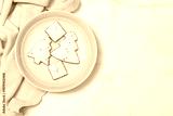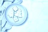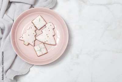 Plate with tasty homemade Christmas gingerbread cookies, top view, flat lay with space for your xmas greetings, concept of winter holidays desserts and decoration