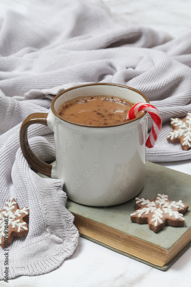 Christmas gingerbread cookies and chocolate milk mug with candy cane stick, concept of winter holidays desserts and decoration
