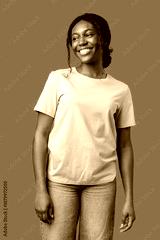 Young woman smiling joyfully in a pink shirt against a vibrant green background in a cheerful atmosphere