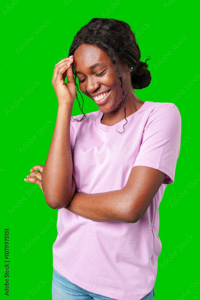 Happy young person laughing and playfully covering face while standing against a bright green background