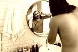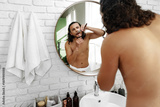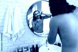 A man with curly hair grooming himself in the bathroom while looking into a round mirror