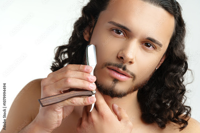 Man with curly hair grooming his beard carefully using a straight razor against a plain white background