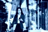 Using laptop, video call, Smiling young Asia business woman leader entrepreneur in red color suit working outdoor urban street walk.