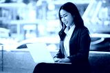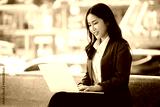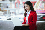 Asian businesswoman in red suit holding tablet while standing in city during daytime