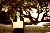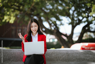 Asian businesswoman in red suit holding tablet while standing in city during daytime