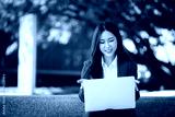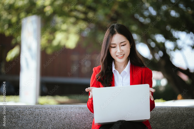 Asian businesswoman in red suit holding tablet while standing in city during daytime