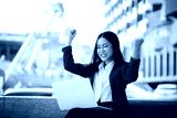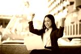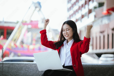 Asian businesswoman in red suit holding tablet while standing in city during daytime