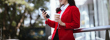 Stylish Asian businesswoman standing confidently in an urban setting holding a tablet. She is dressed in a professional business suit, demonstrating modern leadership and corporate success.