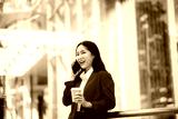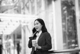 Stylish Asian businesswoman standing confidently in an urban setting holding a tablet. She is dressed in a professional business suit, demonstrating modern leadership and corporate success.