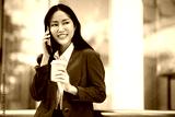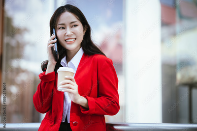 Stylish Asian businesswoman standing confidently in an urban setting holding a tablet. She is dressed in a professional business suit, demonstrating modern leadership and corporate success.