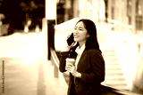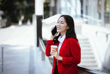 Stylish Asian businesswoman standing confidently in an urban setting holding a tablet. She is dressed in a professional business suit, demonstrating modern leadership and corporate success.