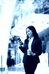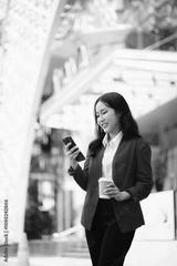 Stylish Asian businesswoman standing confidently in an urban setting holding a tablet. She is dressed in a professional business suit, demonstrating modern leadership and corporate success.