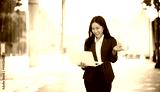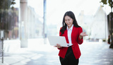 Confident Asian businesswoman standing in a modern city with a smile while using a smartphone. She is dressed professionally.