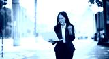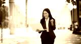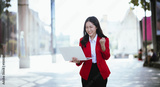 Confident Asian businesswoman standing in a modern city with a smile while using a smartphone. She is dressed professionally.