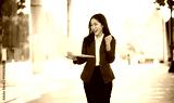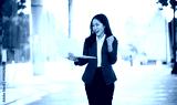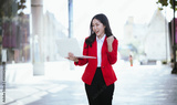 Confident Asian businesswoman standing in a modern city with a smile while using a smartphone. She is dressed professionally.
