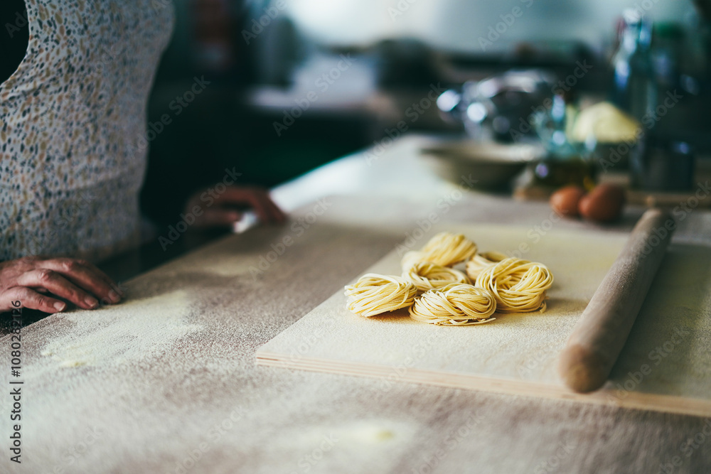 Woman preparing handmade tagliatelle at home for winter and Christmas holidays - Cooking and raw food concept - Focus on center pasta