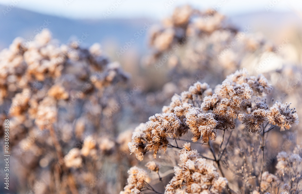 Plants frozen with frost after the first autumn frost in the morning