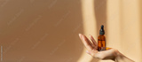 Bottle of serum in women's hands. Glass bottle with dropper cap on a beige banner with a copy space. Unmarked Amber container in sunlight